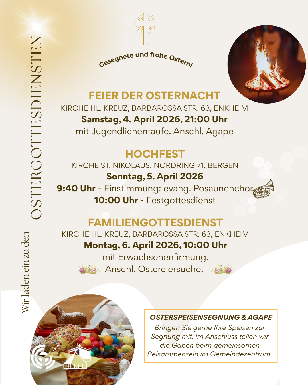 wir laden euch herzlich ein, die Feier der Auferstehung Jesu Christi gemeinsam mit uns zu erleben. In diesen besonderen Tagen möchten wir innehalten, hoffen, danken und die Freude des Osterfestes miteinander teilen.