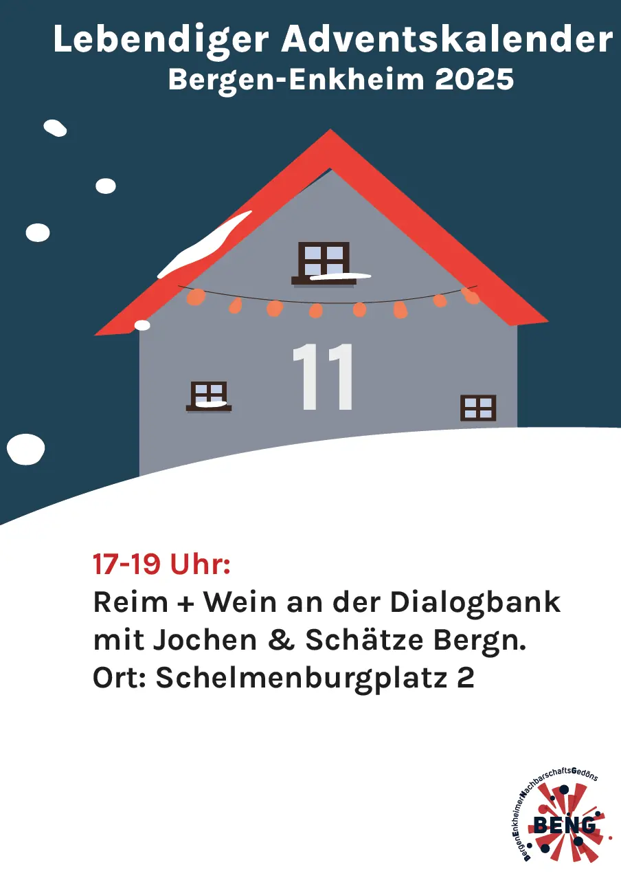 Auch 2025 gibt es in Bergen-Enkheim wieder den lebendigen Adventskalender: Täglich öffnen sich kleine Türen mit liebevollen Aktionen wie Geschichten, Musik, Basteln, Glühwein oder gemeinsamem Innehalten. Danke an alle Mitwirkenden und Unterstützenden – kommt vorbei, lernt Nachbar*innen kennen und erlebt die Adventszeit zusammen.