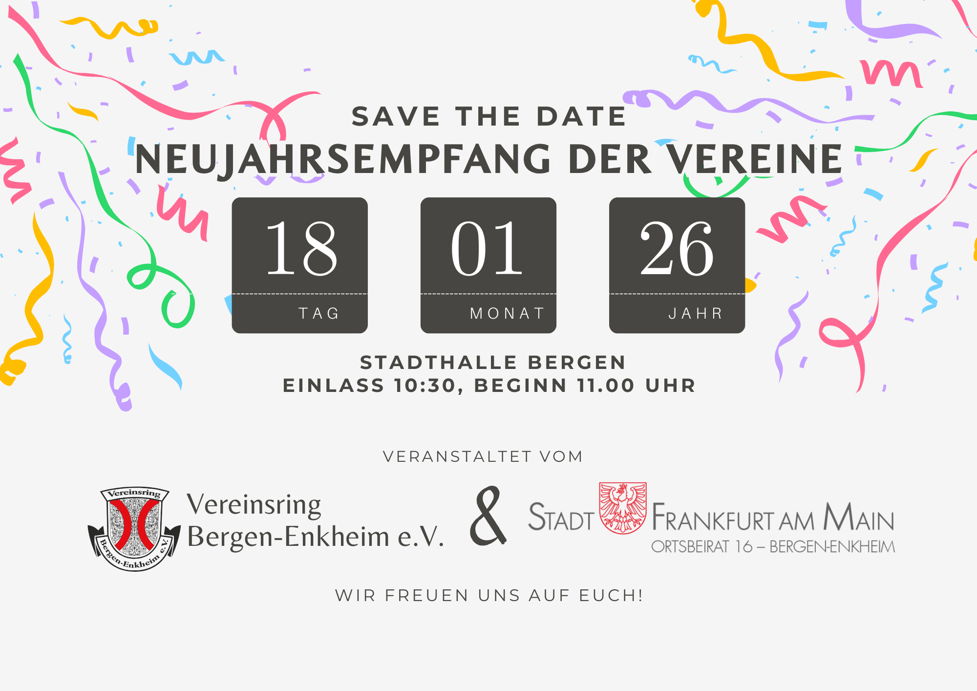 Der Ortsbeirat 16 & der Vereinsring Bergen-Enkheim e.V. freuen sich auf einen feierlichen Start ins neue Jahr – im Kreis unserer geladenen Gäste. Vereine & Institutionen: Gestaltet das Bühnenprogramm gern bunt mit! Vielen Dank für Ihr Verständnis.