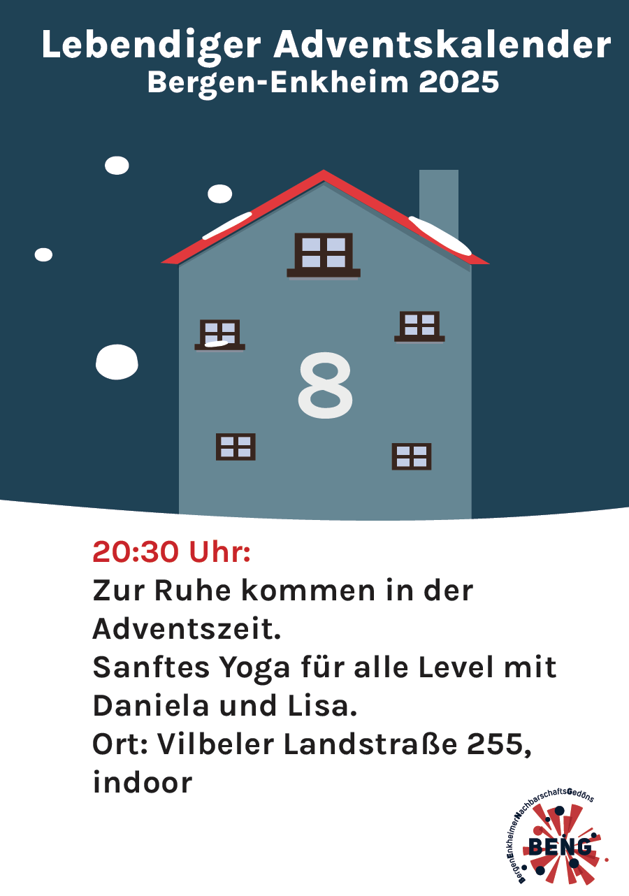 Auch 2025 gibt es in Bergen-Enkheim wieder den lebendigen Adventskalender: Täglich öffnen sich kleine Türen mit liebevollen Aktionen wie Geschichten, Musik, Basteln, Glühwein oder gemeinsamem Innehalten. Danke an alle Mitwirkenden und Unterstützenden – kommt vorbei, lernt Nachbar*innen kennen und erlebt die Adventszeit zusammen.