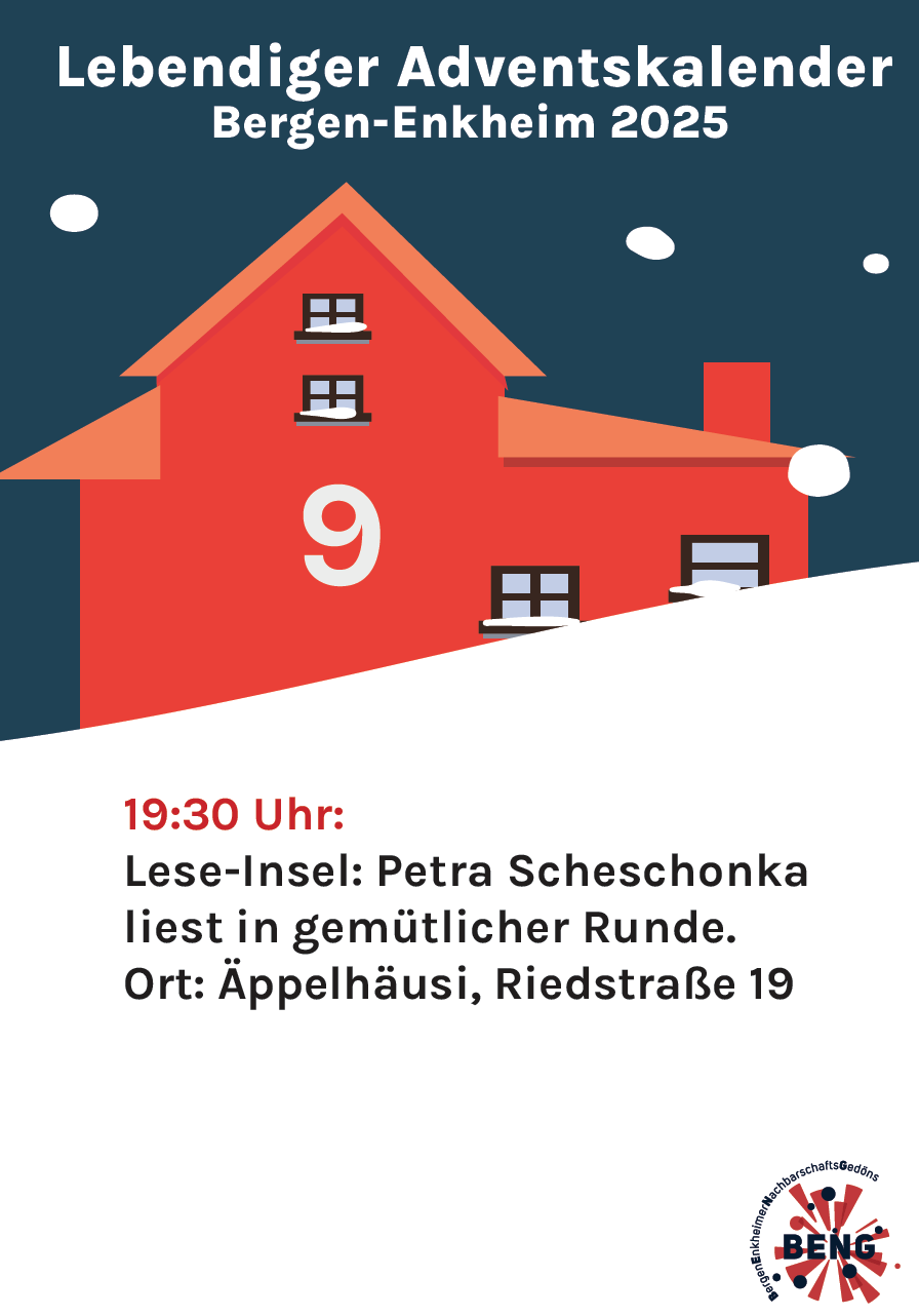 Auch 2025 gibt es in Bergen-Enkheim wieder den lebendigen Adventskalender: Täglich öffnen sich kleine Türen mit liebevollen Aktionen wie Geschichten, Musik, Basteln, Glühwein oder gemeinsamem Innehalten. Danke an alle Mitwirkenden und Unterstützenden – kommt vorbei, lernt Nachbar*innen kennen und erlebt die Adventszeit zusammen.