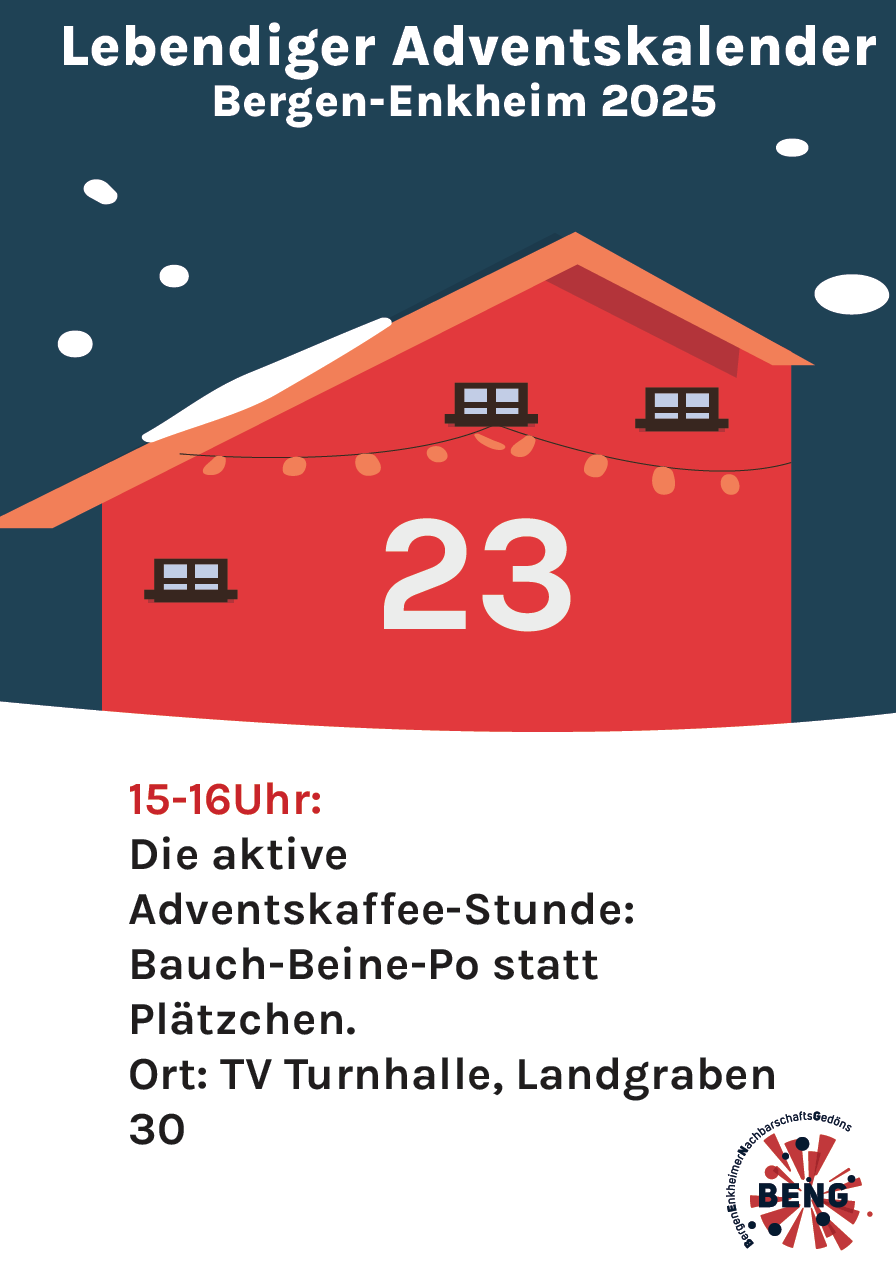 Auch 2025 gibt es in Bergen-Enkheim wieder den lebendigen Adventskalender: Täglich öffnen sich kleine Türen mit liebevollen Aktionen wie Geschichten, Musik, Basteln, Glühwein oder gemeinsamem Innehalten. Danke an alle Mitwirkenden und Unterstützenden – kommt vorbei, lernt Nachbar*innen kennen und erlebt die Adventszeit zusammen.